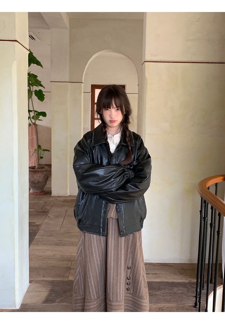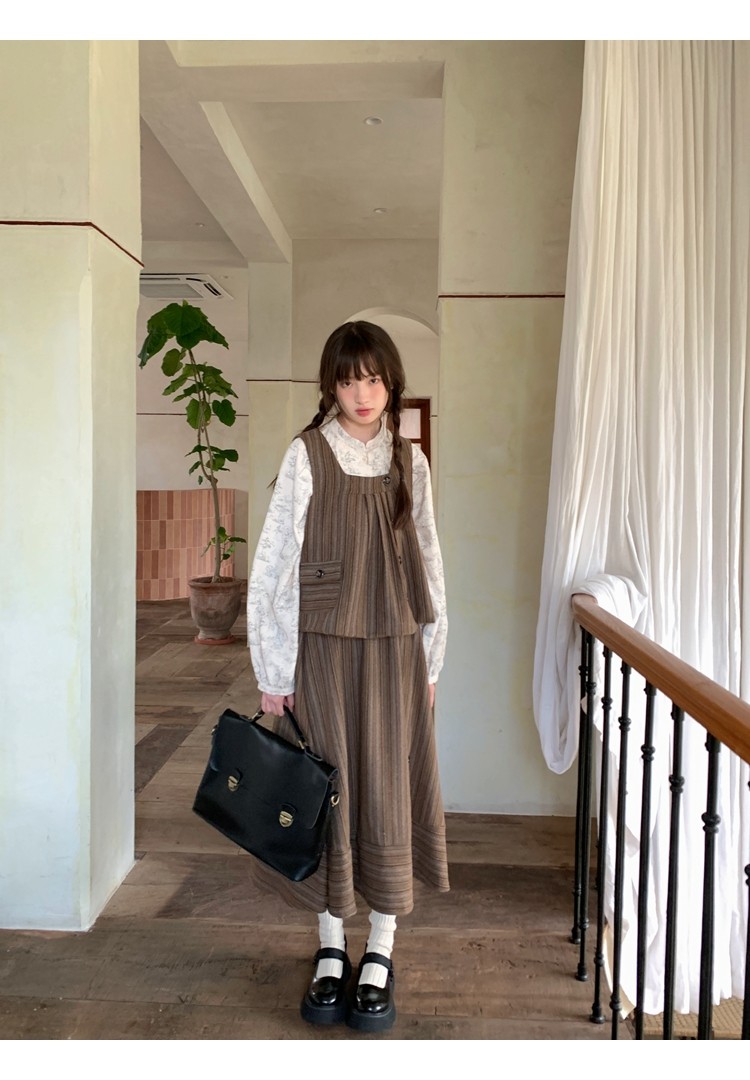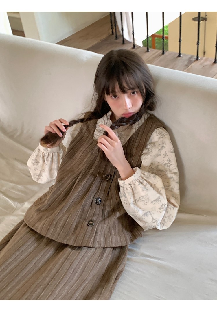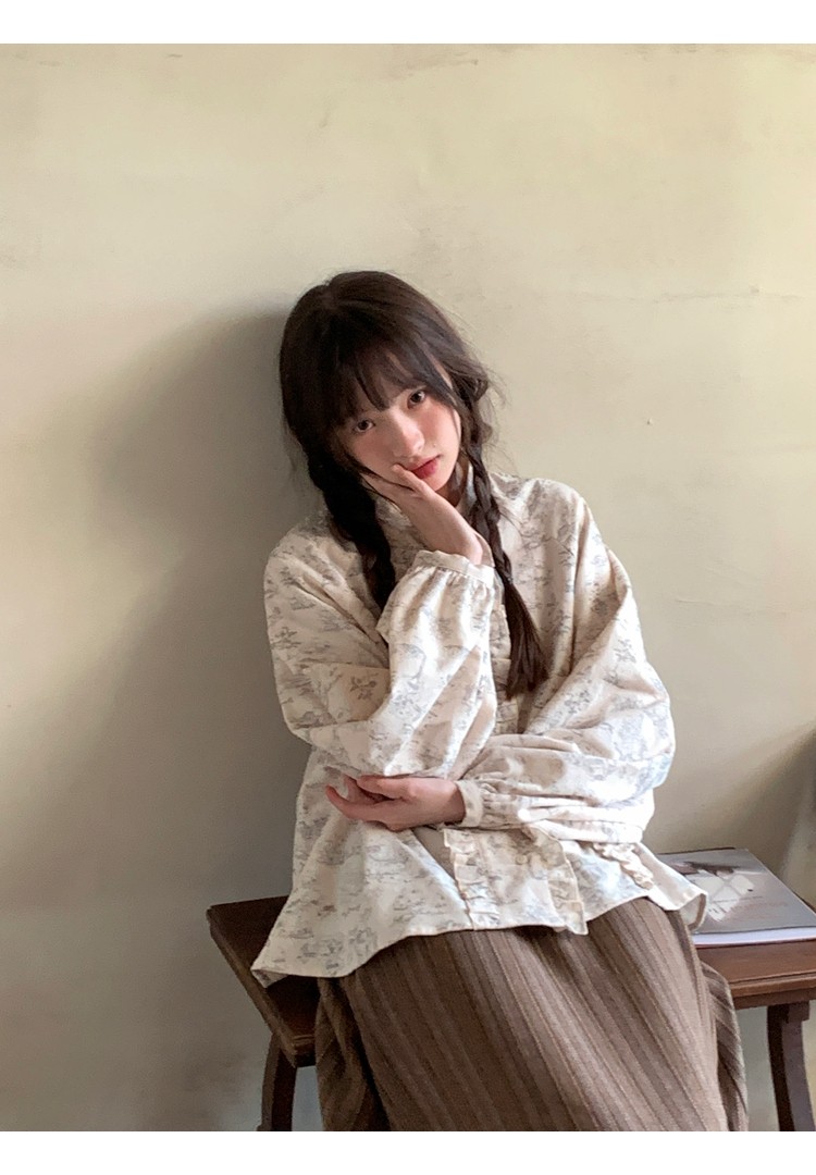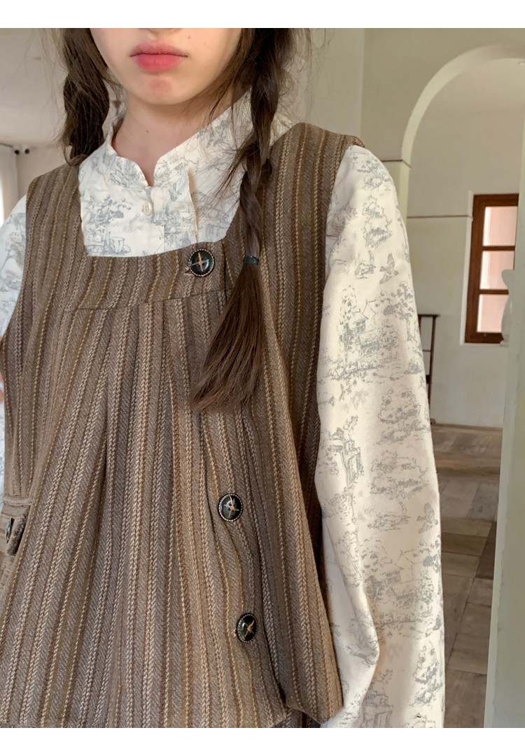 森系撞色竖条纹翻领长袖衬衫女春秋防晒衬衣做旧复古别致蓝色上衣