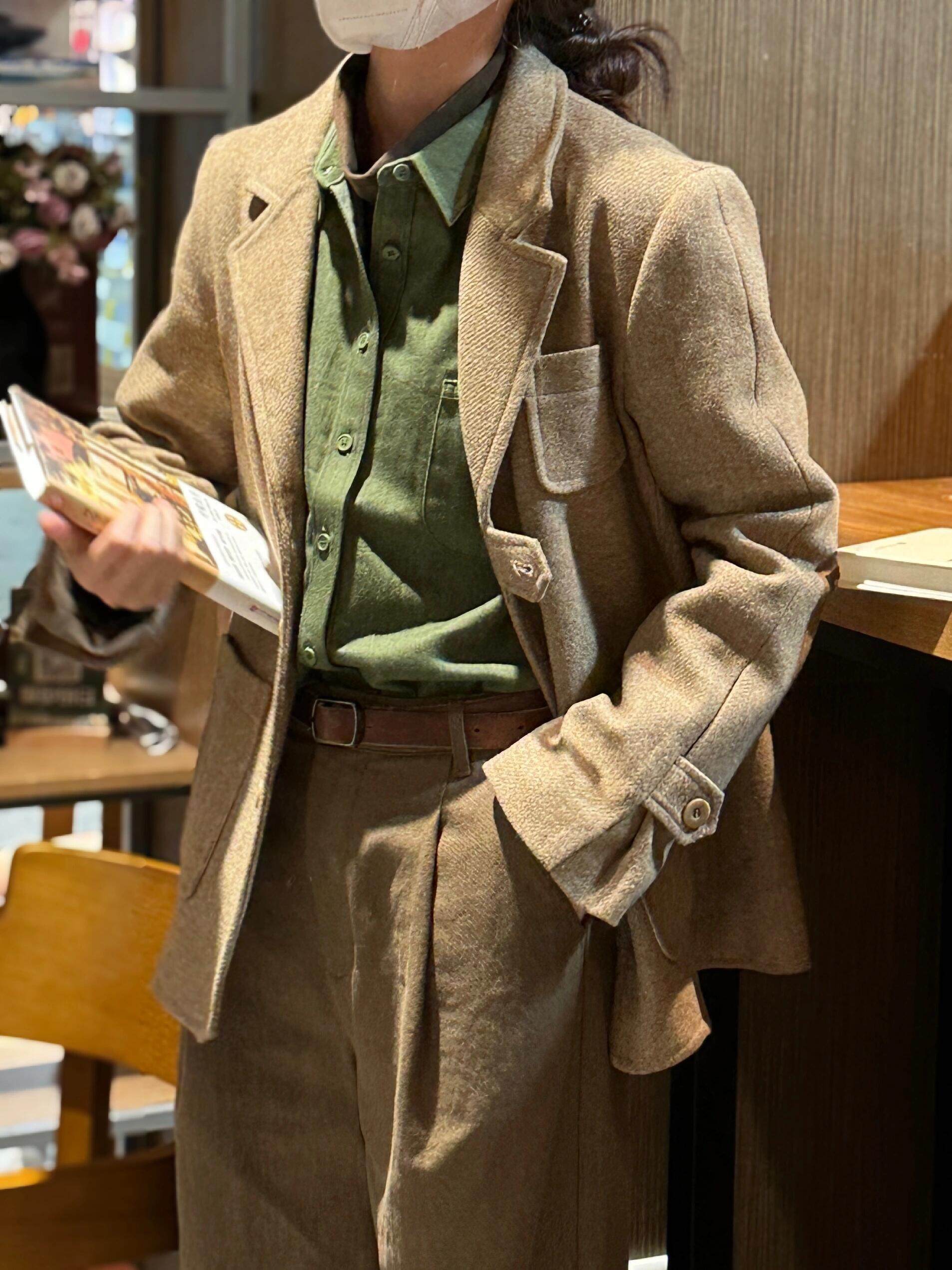 新中式花边森系禅意宽松复古磨毛棉立领水墨印花衬衫上衣