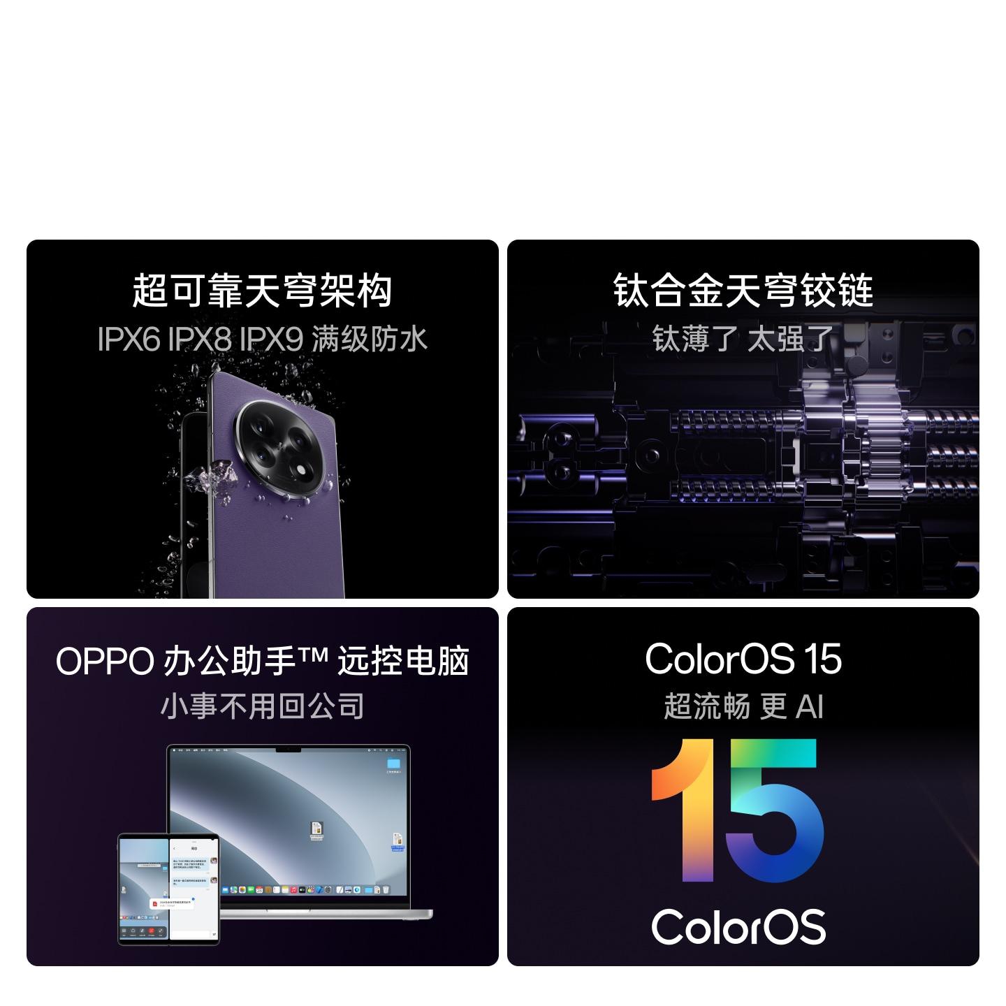 内屏采用超平整镜面钻石屏,通过德国莱茵TÜV无感折痕认证,折痕控制出色;外屏窄边框设计,屏占比与分辨率显著提升。支持OPPO办公助手和O+互联,可远控电脑、一碰传输iPhone实况照片,实现“小事不用回公司”的高效办公。