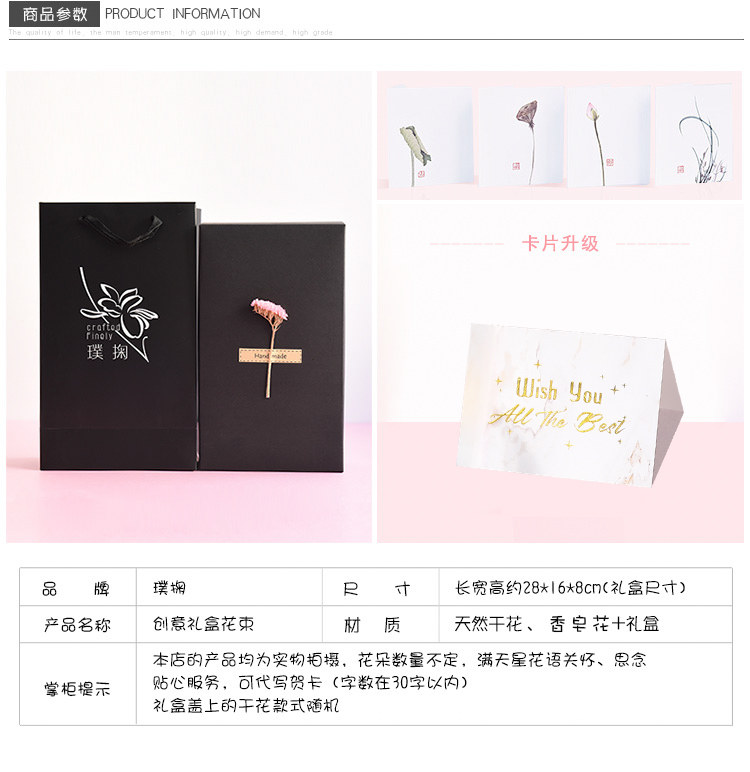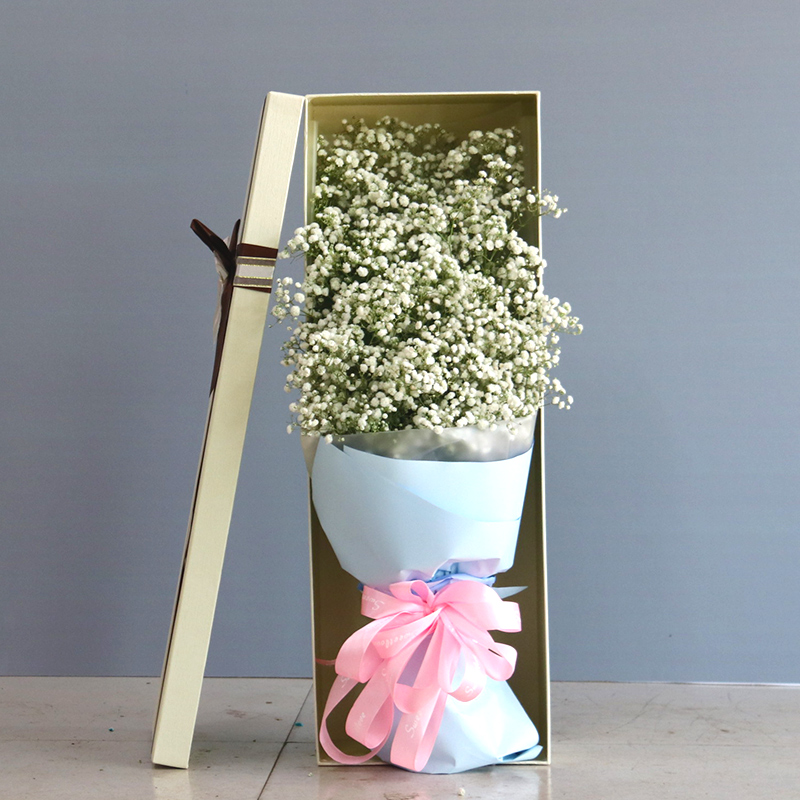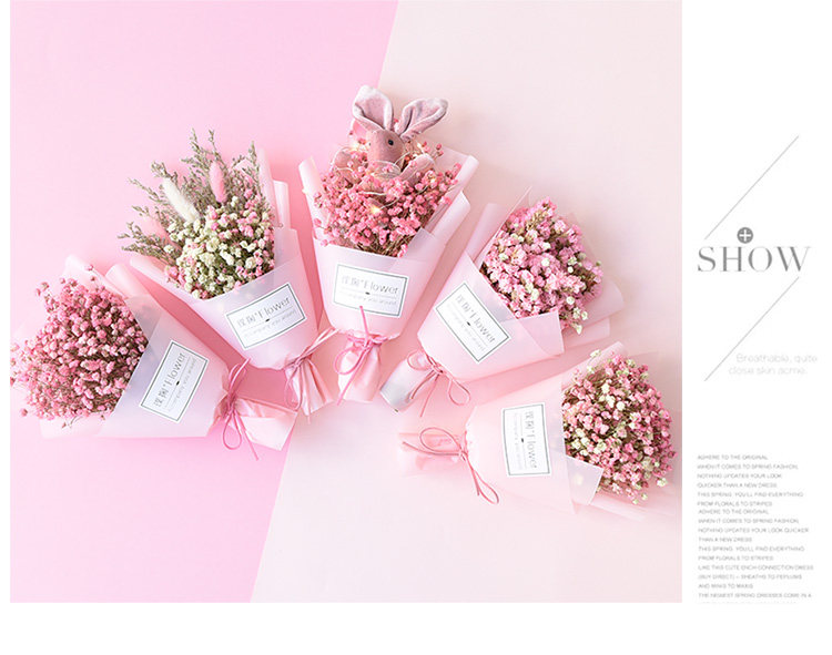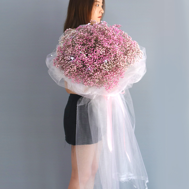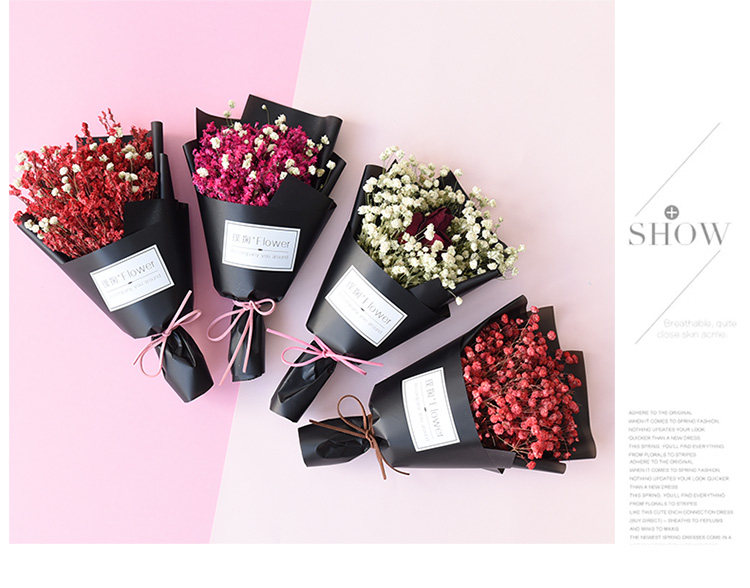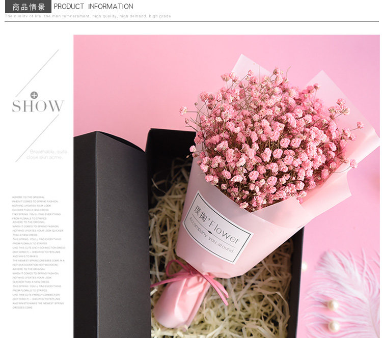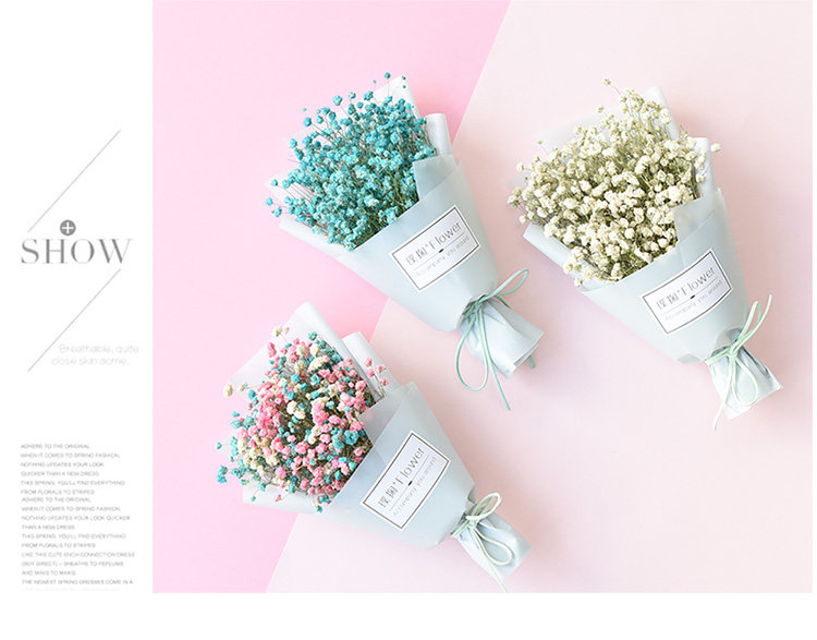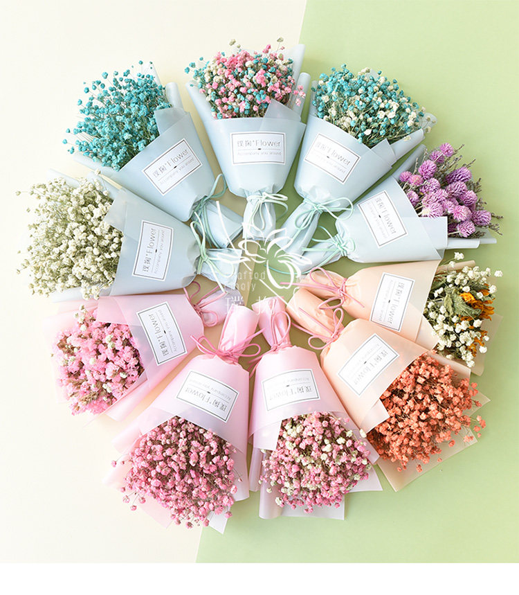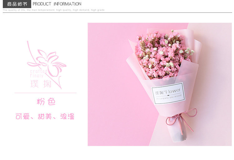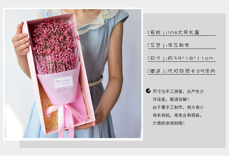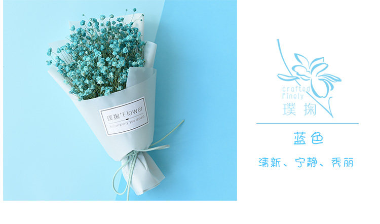 由于彩色的满天星和勿忘我是人工染色的,故每一批花的颜色有可能存在色差,亲请谅解。