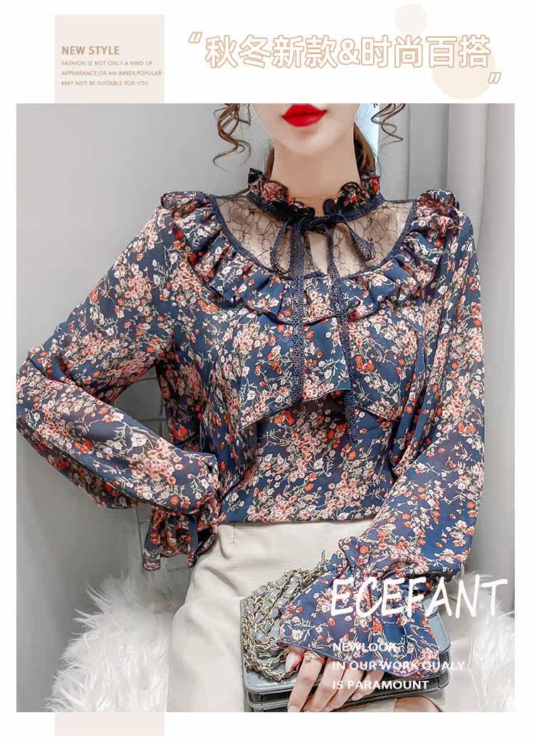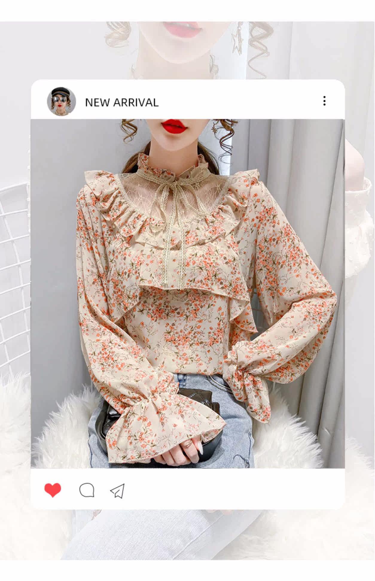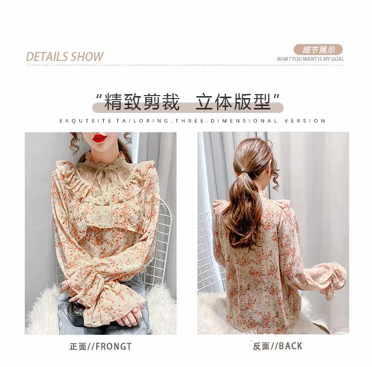 碎花衬衫女设计感小众2021早秋新款洋气百搭甜美系带荷叶边上衣潮