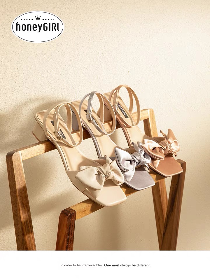 honeyGIRL甜粉粗跟凉鞋女夏2021新款蝴蝶结仙女鞋一字扣带高跟鞋