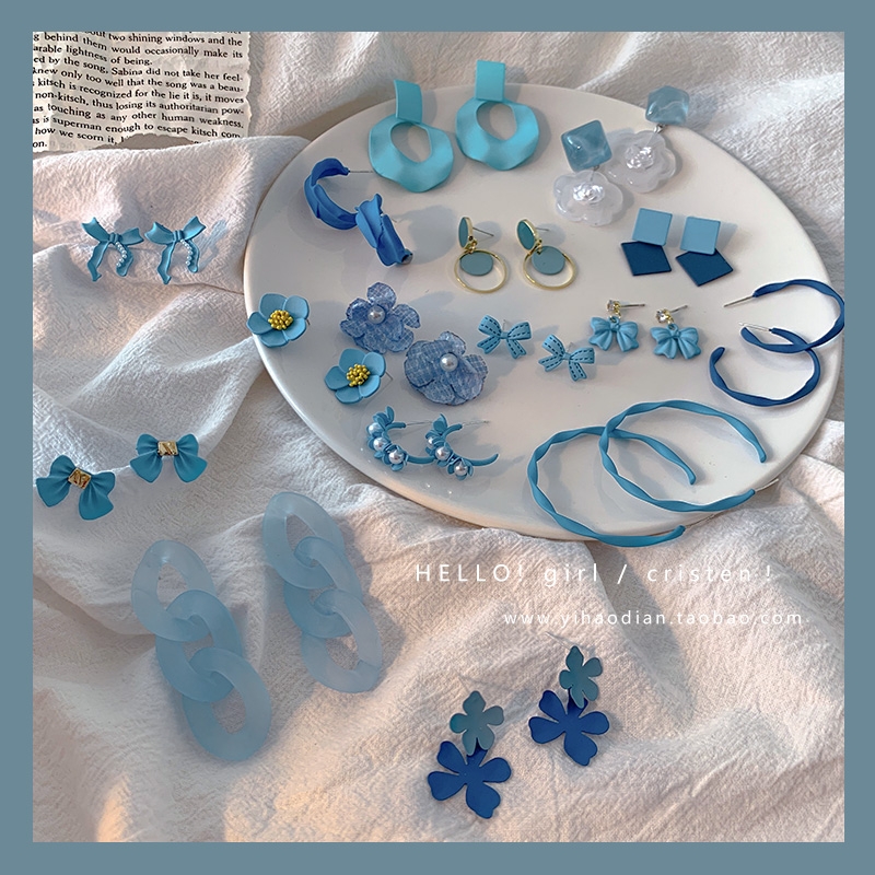 原创款渐变色小熊耳环粉色蓝色软妹日系格子蝴蝶结耳钉耳饰耳夹