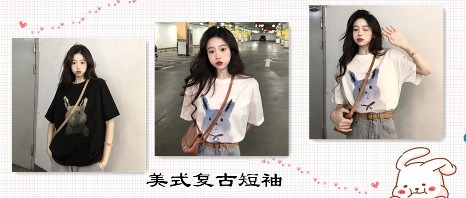 美式复古黑色纯棉短袖t恤女夏宽松百搭兔子印花正肩半袖上衣体恤 T恤 黑色 XL