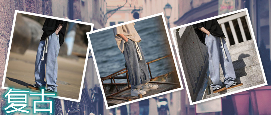 抽绳牛仔裤男夏季薄款潮牌宽松直筒阔腿裤高街潮流百搭休闲长裤子 牛仔裤 复古色 S