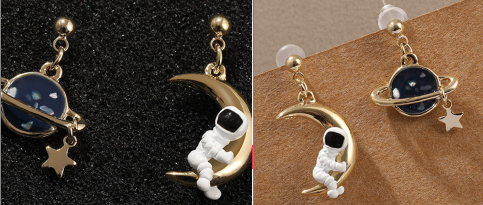 月亮宇航员耳钉不对称耳环无耳洞耳夹酷暗黑系925银针耳饰