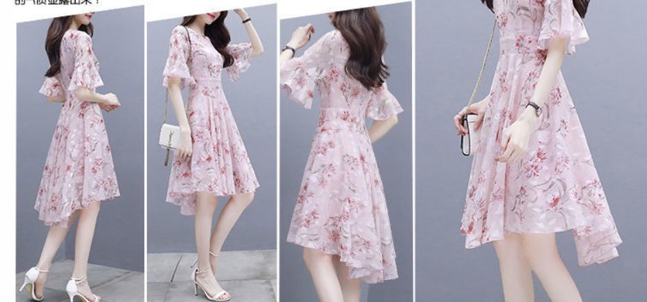 LEDE雪纺连衣裙女装夏装修身显瘦超仙气质中长款小个子碎花裙子夏天短袖衣服潮