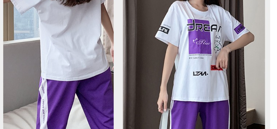 运动服套装女夏季新款时尚潮牌洋气短袖T恤女休闲九分裤中学生两件装 白衣蓝裤