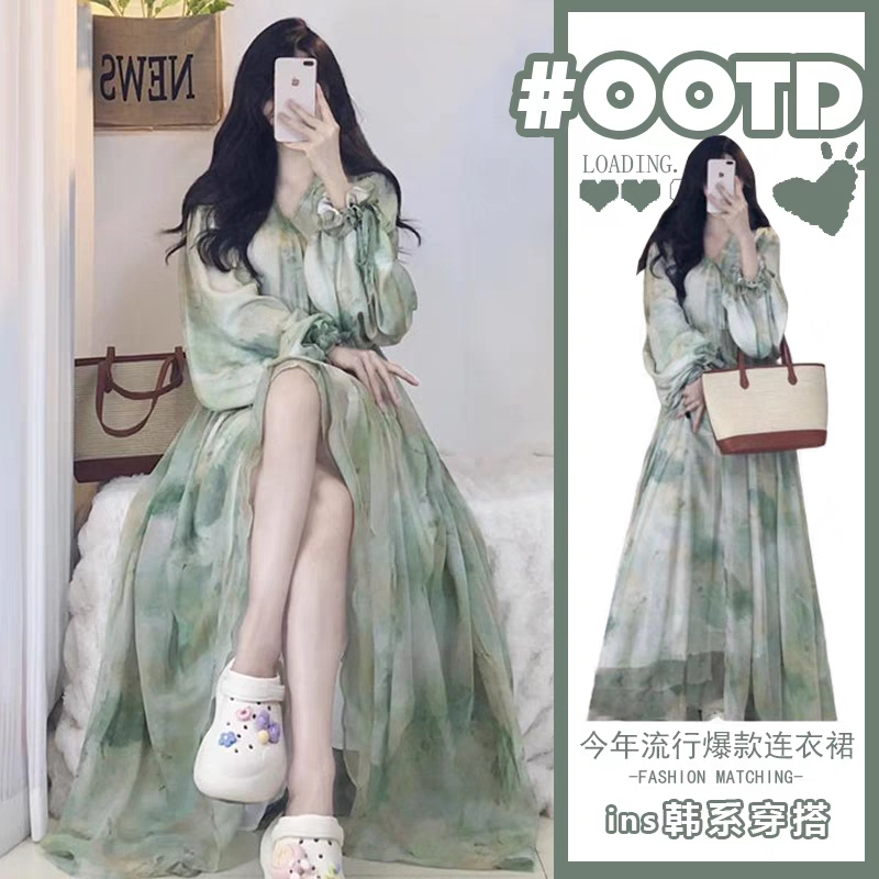 温柔风浅绿色碎花连衣裙女春秋季2023新款中长款灯笼袖别致大摆裙