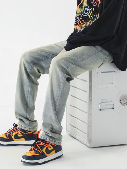 联名水洗复古做旧港风高街潮流直筒长裤子男士学生