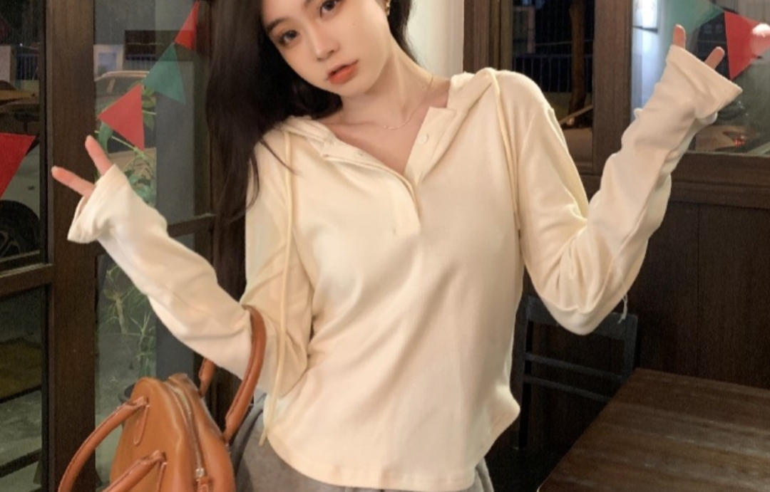 YUNWUXIN杏色连帽长袖T恤女秋季2022新款百搭显瘦打底衫洋气抽绳短款上衣