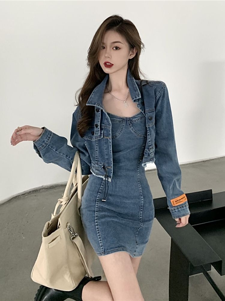 2023春秋新款性感辣妹包臀时尚气质吊带牛仔连衣裙女两件套小个子
