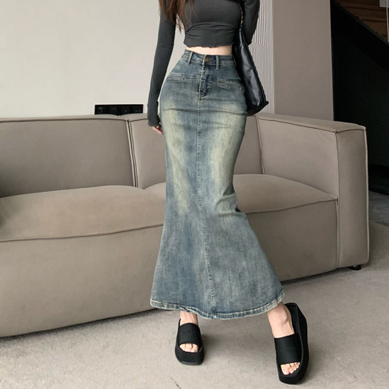 2023春夏新款复古蓝高腰包臀鱼尾牛仔裙女显瘦中长款开叉半身长裙