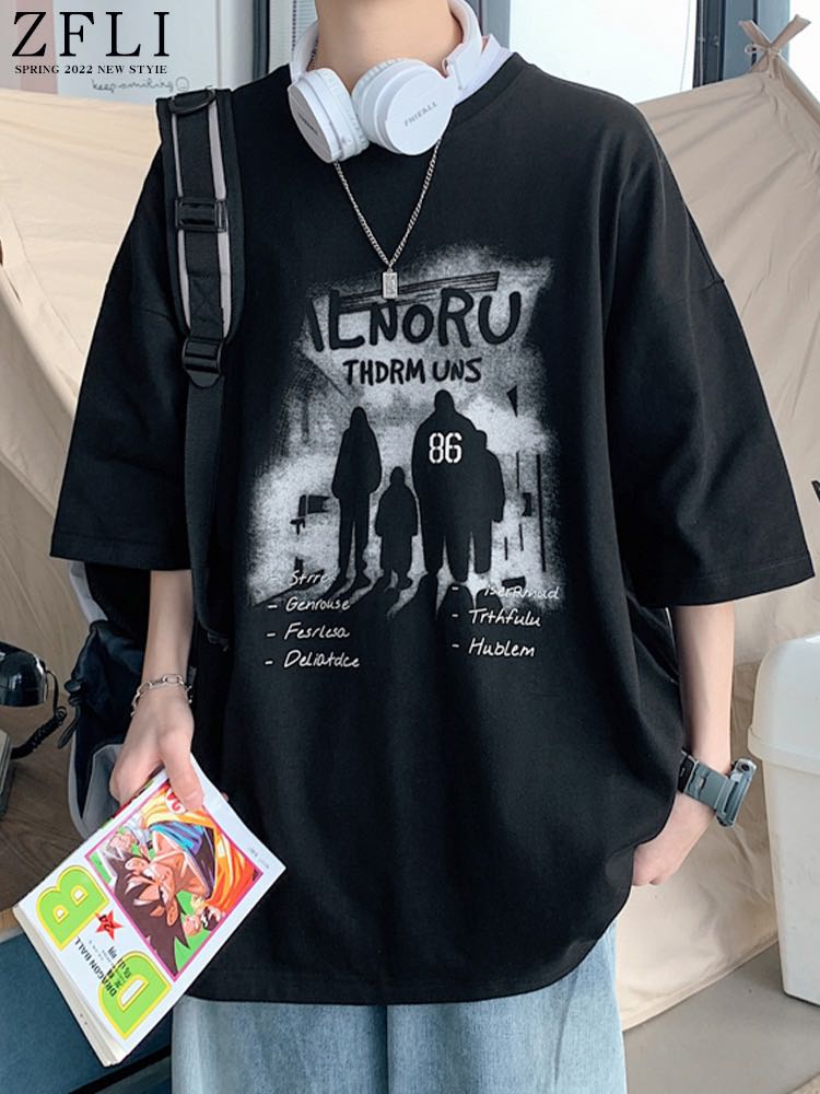 美式复古潮牌短袖男装2023新款港风宽松t恤男士夏季半袖冰丝体恤 冰丝短袖 黑色 M