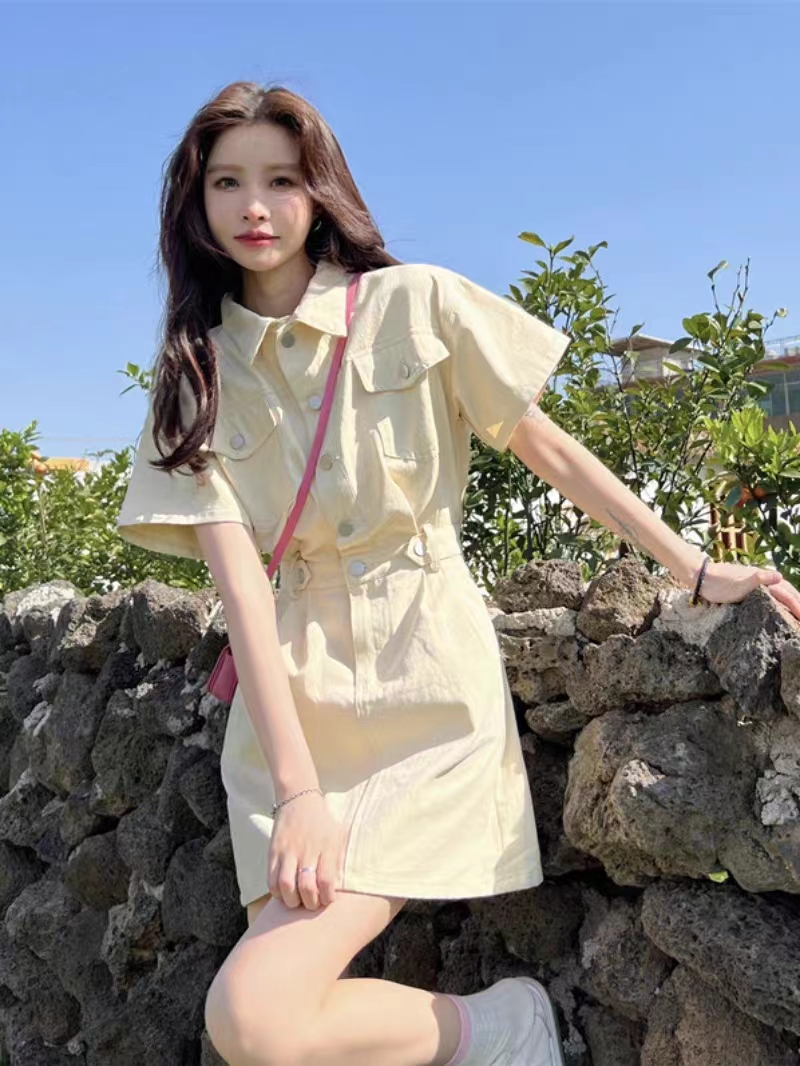 韩版时尚收腰显瘦短袖牛仔连衣裙女气质