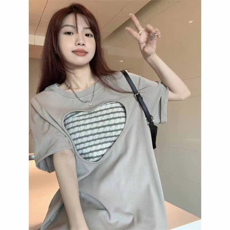 韩版高级感甜辣风灰色宽松镂空爱心短袖T恤上衣条纹两件套潮服