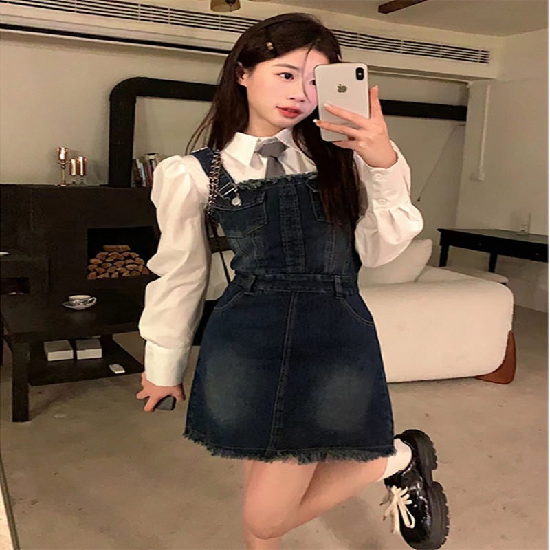 复古水洗毛边牛仔背带连衣裙女春季2023新款收腰显瘦甜辣包臀短裙