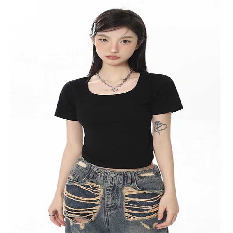 方领正肩短袖T恤女夏季打底衫内搭纯色短款半袖显瘦上衣2023新款