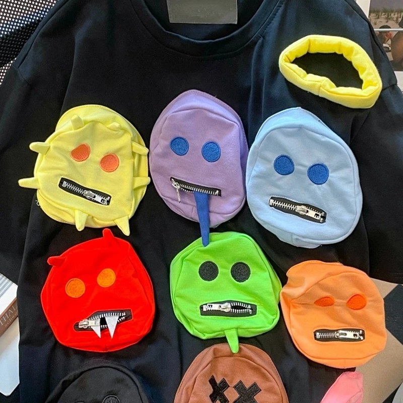 直接的视觉冲击,前面由彩虹色的小恶魔口袋集合在一起,每个口袋的表情状态都不一样,还搭配了各种小配饰,版型规整,料子软乎。
