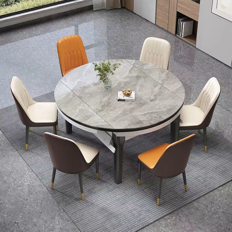 意式岩板亮面餐桌椅组合家用可伸缩变圆小户型实木现代简约长方形