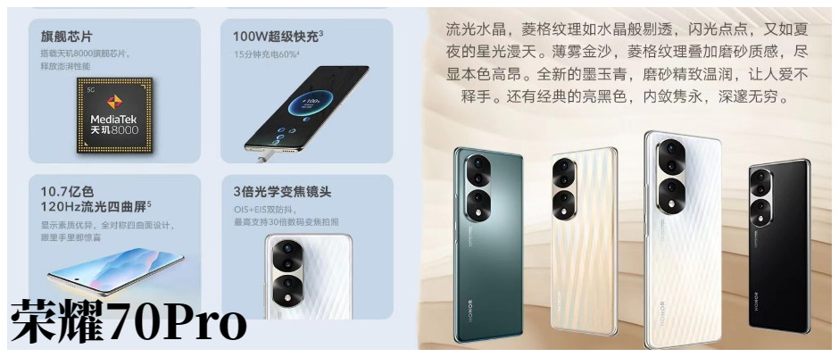 荣耀70 Pro IMX800三主摄 天玑8000旗舰芯片 100W超级快充 5G手机