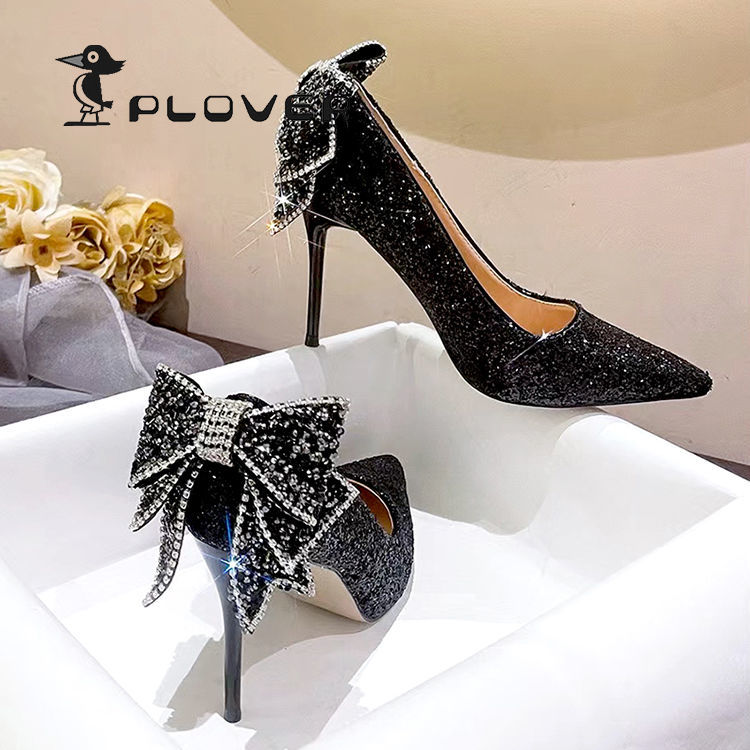 法式水晶鞋2023春秋新款银色婚鞋水钻蝴蝶结尖头高跟鞋女细跟单鞋