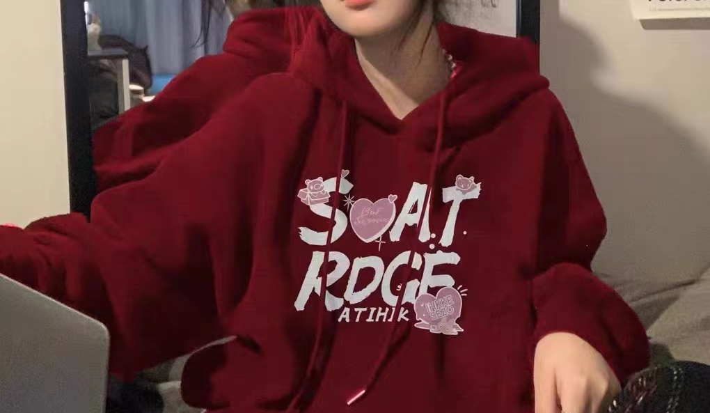 美式hiphop连帽卫衣女2023新款秋季加绒酒红色