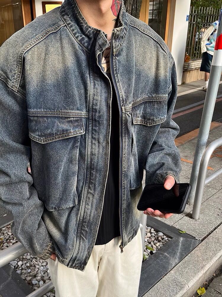 OXFREAK「立体大口袋设计」渐变水洗牛仔夹克男短款阔版立领外套