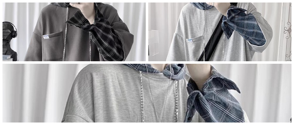 假两件卫衣男潮牌格子拼接连帽外套韩版原宿春秋季潮流宽松套头衫 黑色 xl