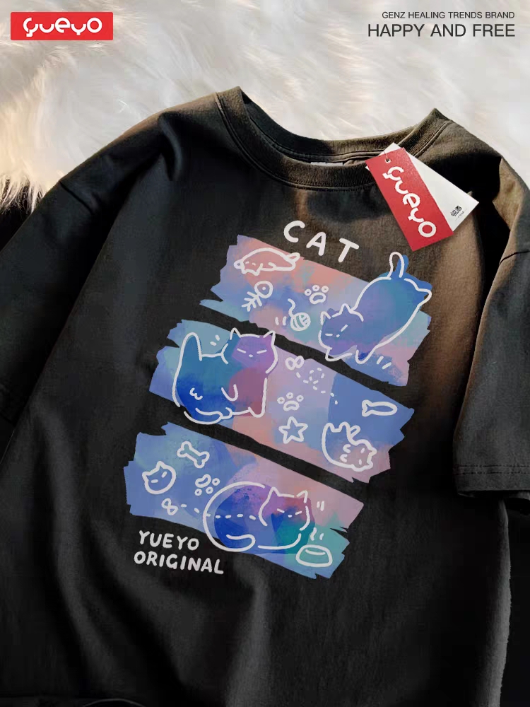 依依 纯棉宽松透气夏季女装T恤 炫彩猫猫 包邮