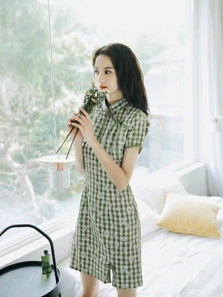 国民风旗袍短款粉色格子旗袍女2023夏季新款修身淑女改良版复古风