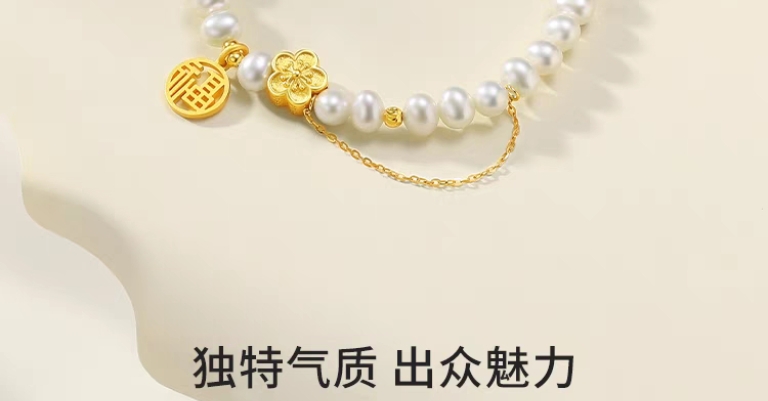 周大福999足金铃兰花淡水珍珠手链女款搭配黄金运转珠送女友老婆