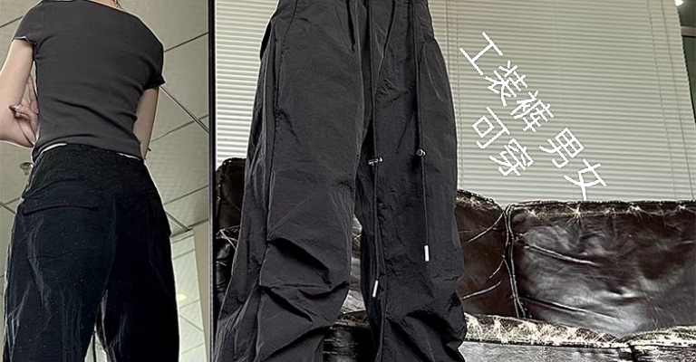 NE21OUS秋季降落伞兵阔腿冲锋裤子微喇2023美式复古黑色工装裤女