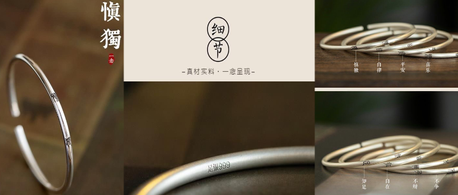 《君子慎独》文艺99纯银细手镯小篆文字中式国朝手镯 素银 慎独