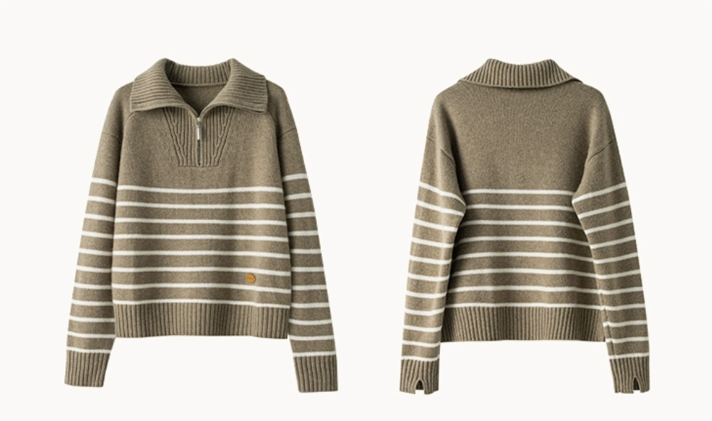 2023年新款美利奴全羊毛针织衫女秋冬半开襟翻领条纹毛衣
