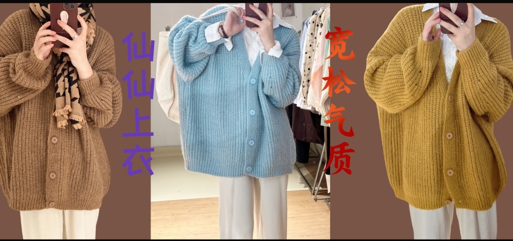 韩国粗针毛衣外套学院v领长袖针织开衫纯色休闲气质宽松披肩外搭