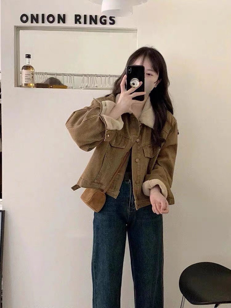 小个子独特别致高级感小众小香风加绒加厚棕色牛仔短外套女秋冬季