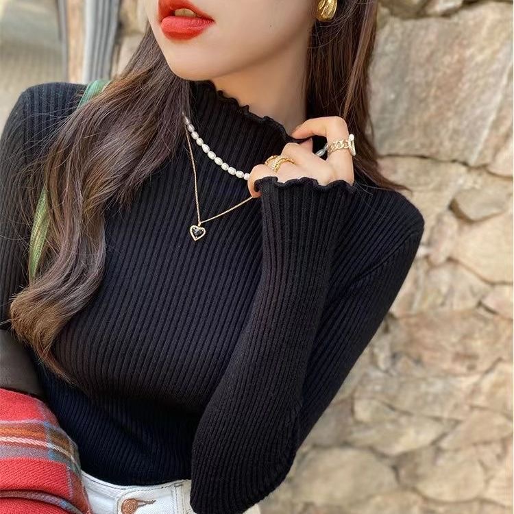 半高领木耳边针织衫女秋冬新款打底毛衣修身显瘦长袖内搭套头上衣