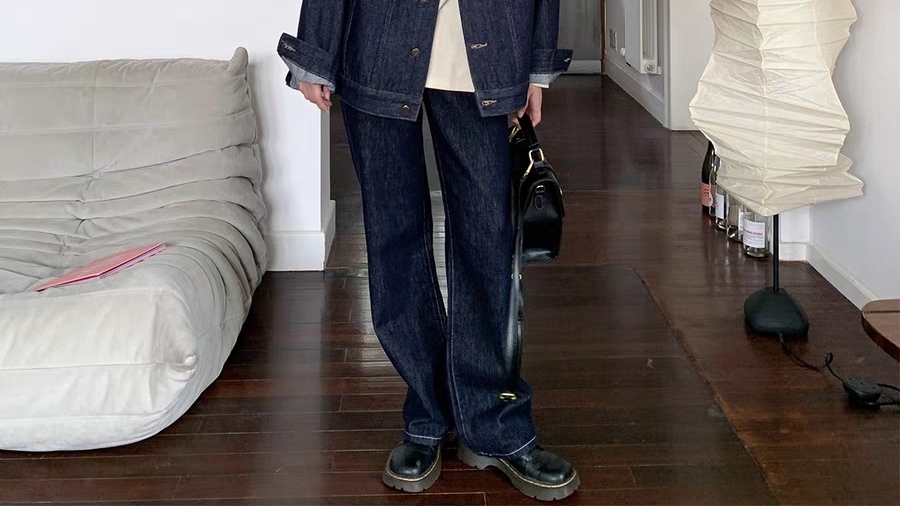 深蓝色高腰直筒牛仔裤2023新款女设计感小个子宽松长裤