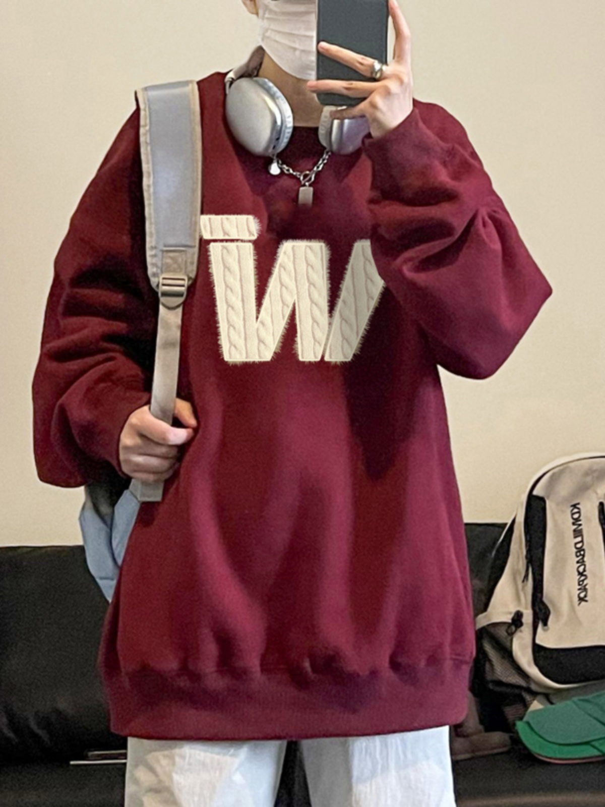 oversize美式酒红色卫衣男生春秋冬加绒重磅外套圆领长袖上衣潮牌