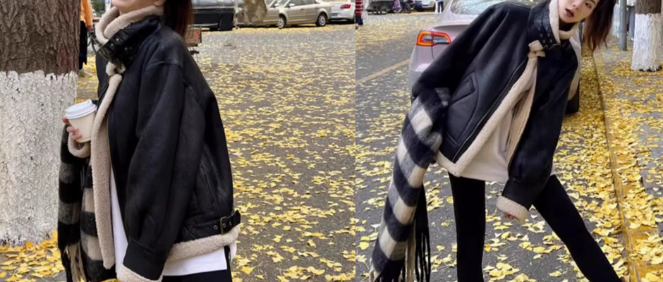 皮毛一体2023年新款羊羔毛外套女秋冬季鹿皮绒机车服夹克加绒加厚