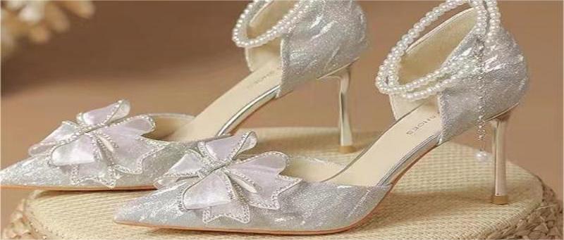 蝴蝶结银色高跟鞋女2023新款尖头气质一字带水晶婚鞋成人礼