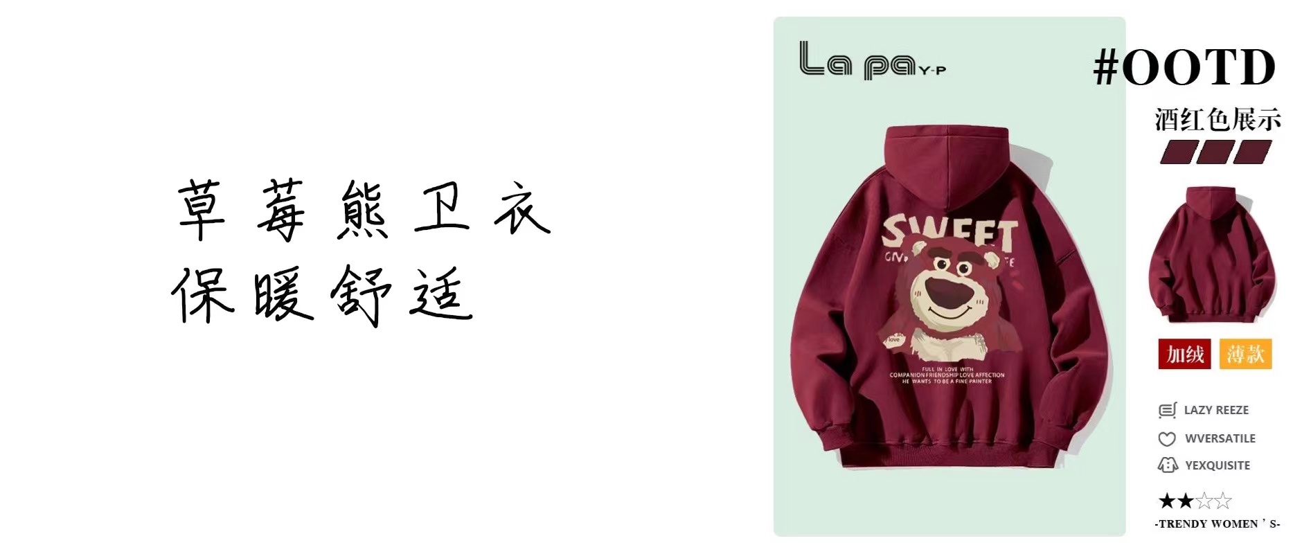 2023秋冬季草莓熊连帽开衫卫衣女酒红色套头小众加绒加厚拉链外套