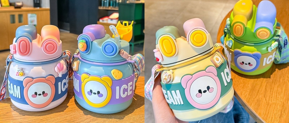 食品级硅胶材质双口吸管,方便携带可调节印花背带,内置硅胶密封圈,内胆材料361不锈钢保温锁冷,外身材质304不锈钢,风格卡通可爱系列,蓝绿粉米黄任你挑选。