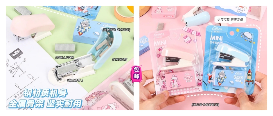迷你式携带,蓝色和粉色随心选,可装订12张,70g复印纸,小巧便捷,单指按压,小巧便捷,敲方便,长时间使用结实耐用,订书机采用ABS树脂外壳和金属制作,经久耐用。
