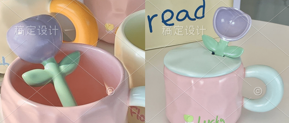 优美家奶fufu郁金香勺子陶瓷马克杯带盖可爱情侣杯牛奶杯水杯套装
