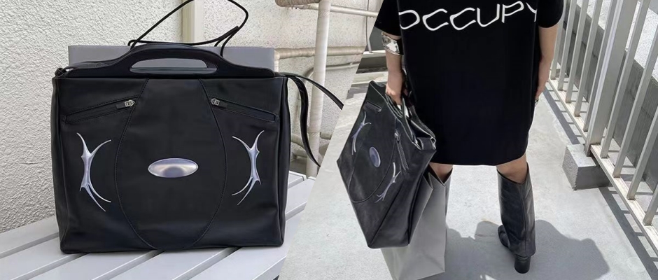 MYFUZZYKON品牌、原创设计、金属印花、大容量机能、黑色斜挎包公文包