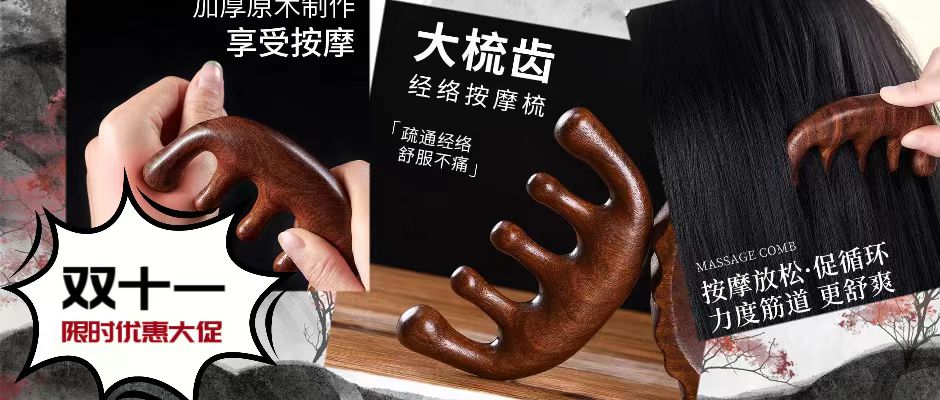 经络按摩梳,圆润梳齿,不伤头发;真檀木无拼接,加厚整木制作;圆头设计更好的保护头皮层,梳头圆润,按摩舒适,不伤皮肤;头部按摩,舒缓头皮,颈部按摩,放松肌肉。