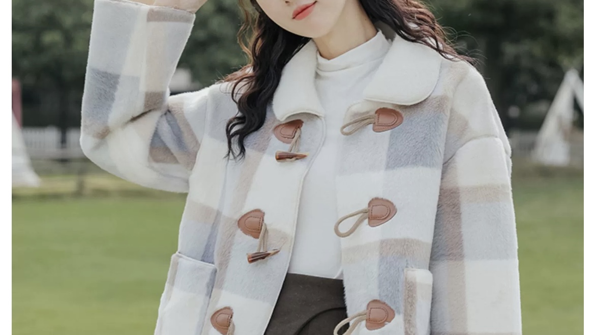 牛角扣格子毛呢外套甜美短款水貂绒外衣女小个子羊绒呢子大衣冬季