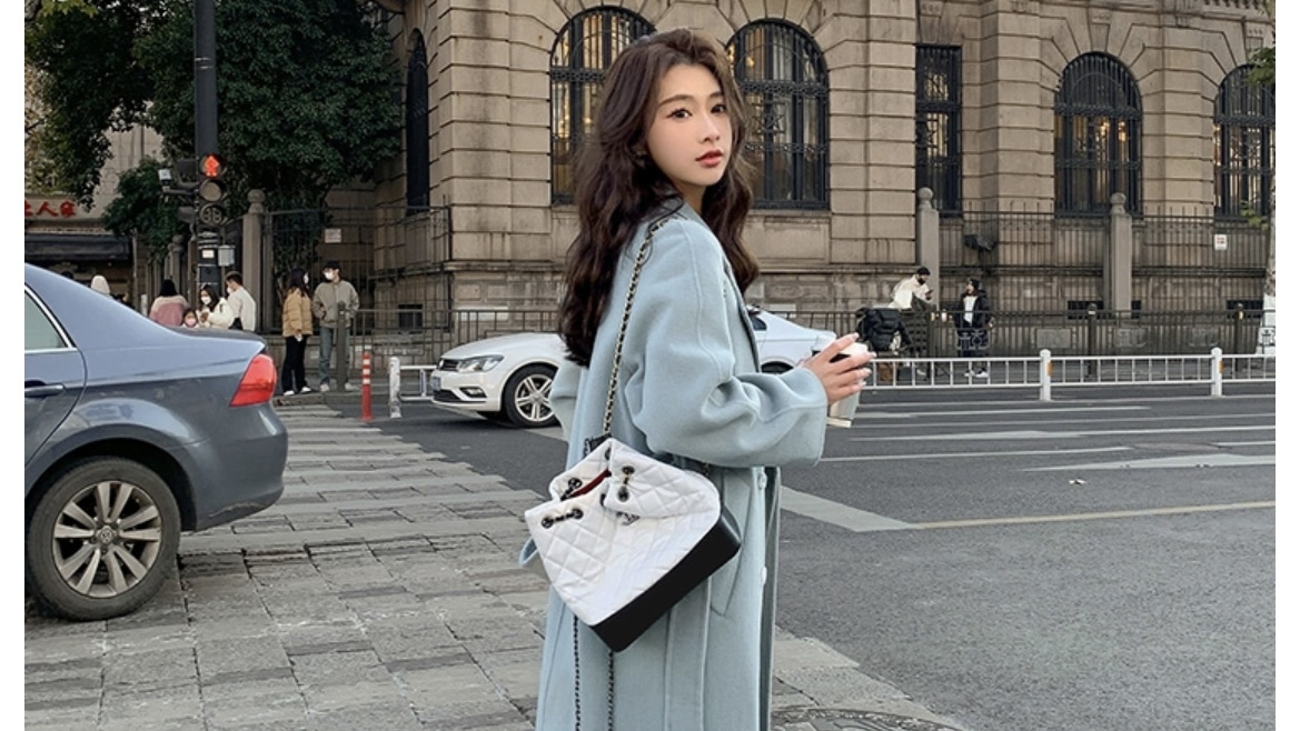 蓝色双面羊绒呢大衣2023年秋冬新款韩版宽松中长款系带毛呢外套女